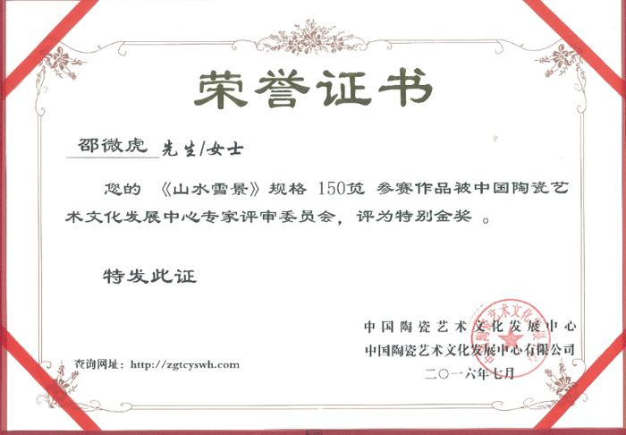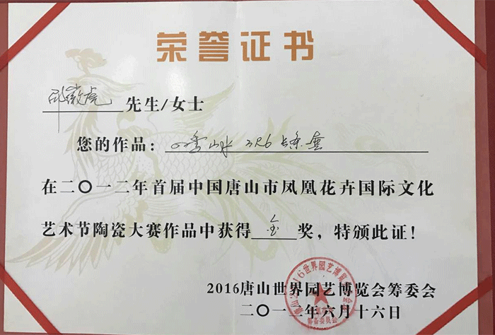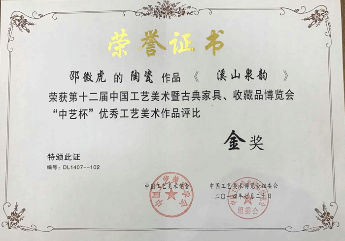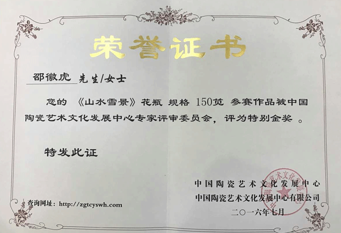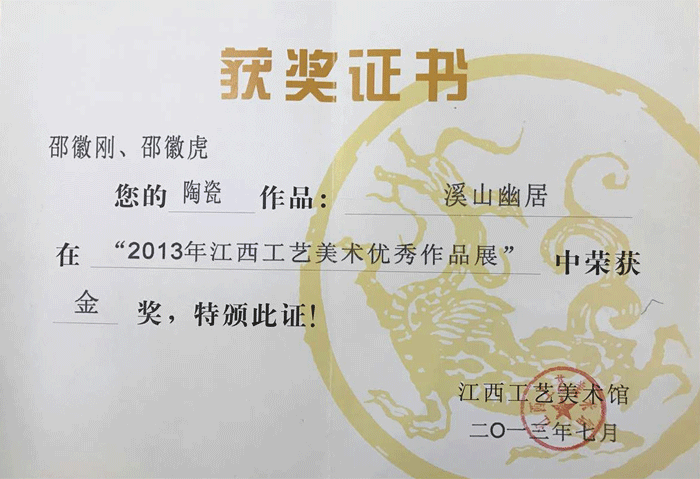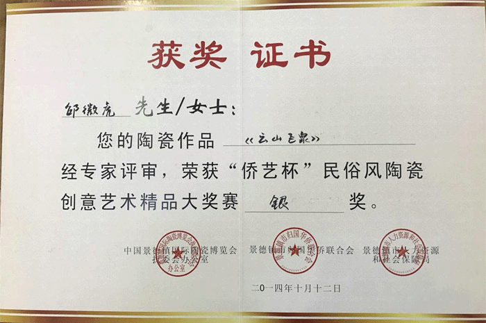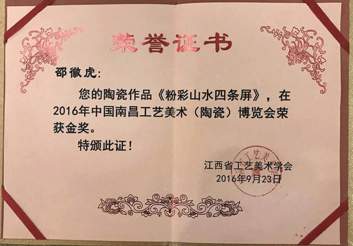 其作品多次獲省市各類金銀獎(jiǎng)項(xiàng),以構(gòu)圖嚴(yán)謹(jǐn)、筆法老道、韻意十足,深受各界陶瓷愛好者的好評(píng)及爭(zhēng)相收藏。