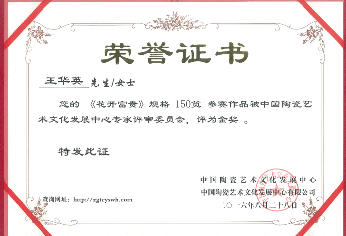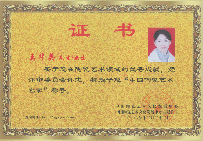 2016年經(jīng)中國陶瓷藝術(shù)文化發(fā)展中心評審委員會(huì)評定為"中國陶瓷藝術(shù)名家".