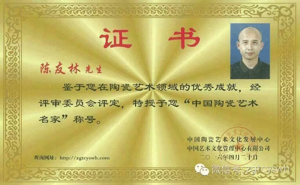 2016年經(jīng)中國陶瓷藝術文化發(fā)展中心評審委員會評定為”中國陶瓷藝術名家“稱號。 |