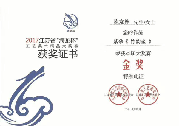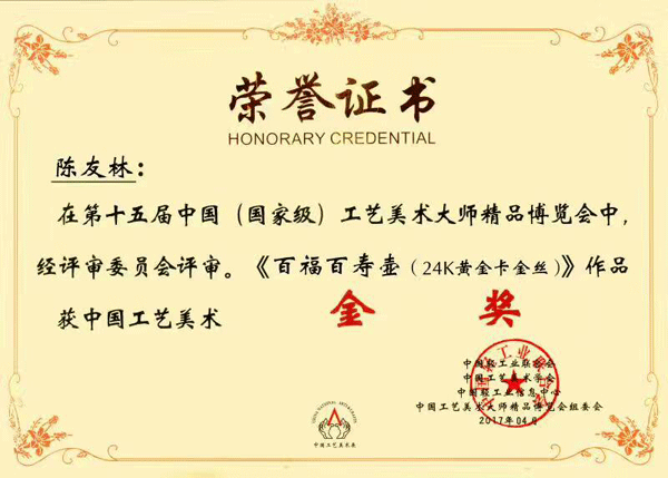 2014年經(jīng)中國工藝美術研究院及中國工藝美術家協(xié)會特授予“中國國家級工藝美術大師終身成就獎 ””中國工藝美術大師“稱號。