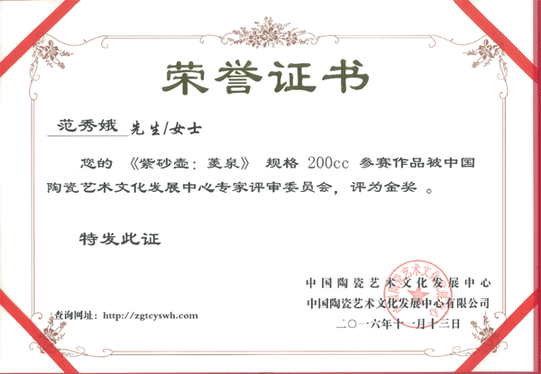 2016年經(jīng)中國陶瓷藝術(shù)文化發(fā)展中心評審委評定為“中國陶瓷藝術(shù)家”。
