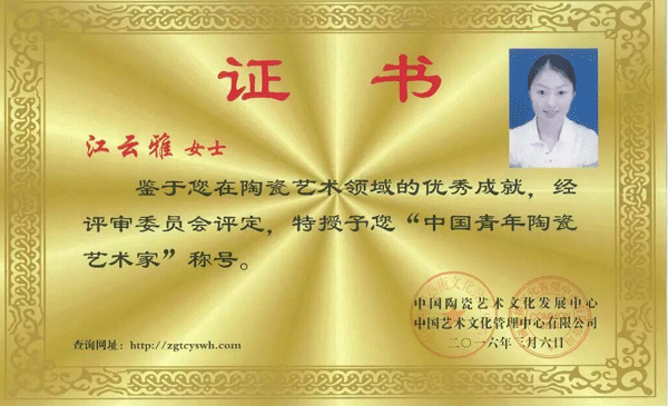 2016年經(jīng)中國陶瓷藝術(shù)文化發(fā)展中心評審委員會評定為“中國青年陶瓷藝術(shù)家”。 |