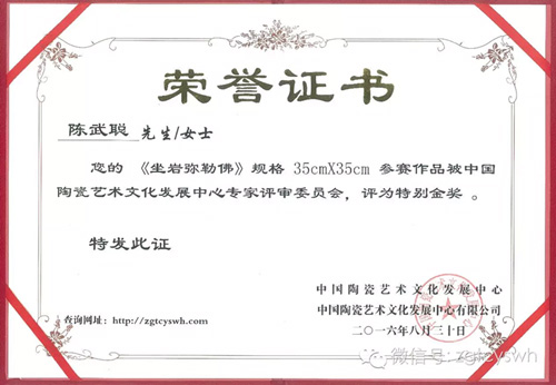 2016年8月30日參賽作品《坐巖彌勒佛》被中國陶瓷藝術(shù)文化發(fā)展中心評為"特別金獎"