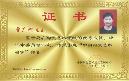 個(gè)人簡(jiǎn)介: 曾廣旭,男,1971年出生于徳化。國(guó)家級(jí)高級(jí)工藝美術(shù)師、中國(guó)陶瓷藝術(shù)名家、中國(guó)陶瓷藝術(shù)文化發(fā)展中心會(huì)員。