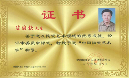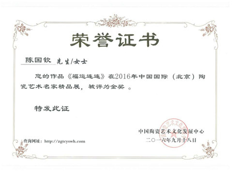 2016年經(jīng)中國陶瓷藝術(shù)文化發(fā)展中心評審委員會評定為“中國陶瓷藝術(shù)家”。
