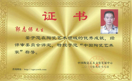 2016年經(jīng)中國(guó)陶瓷藝術(shù)文化發(fā)展中心評(píng)審委員會(huì)評(píng)定為“中國(guó)陶瓷藝術(shù)家”。