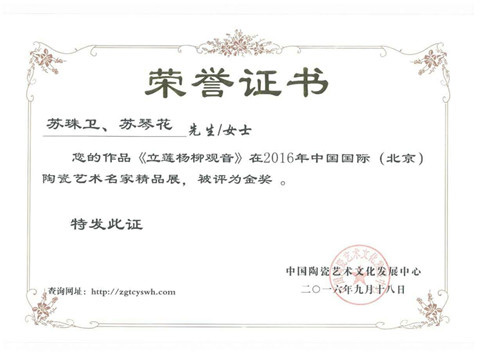 作品《麒麟送子觀音》參加 2016年中國國際(北京)陶瓷藝術(shù)名家精品展作品評比榮獲“特別金獎”。
