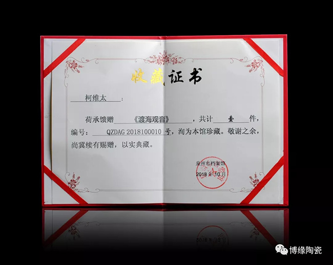 中國青年陶瓷藝術(shù)家柯維太作品《渡海觀音》被泉州市檔案館永久收藏。