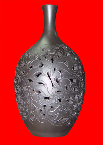 造型奇特,小口,長頸,下部漸豐,腹部豐滿平底。給人以活潑而沉穩(wěn)的感覺。充分展示了鏤空工藝。整體刻以唐草圖案錯落有致,連綿不斷,由卷而舒。給人無限美感?谛《谴,易進難出,具有避邪藏寶,聚集人氣,財氣運氣之功.