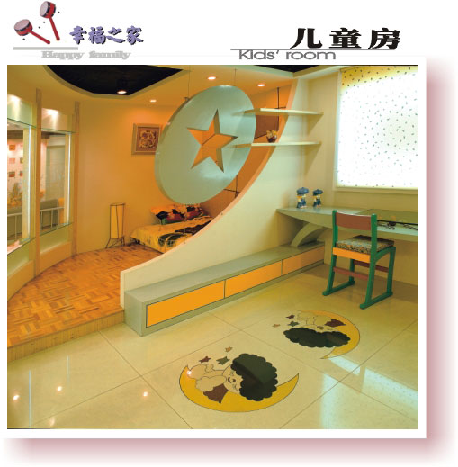 | 睡眠區(qū)以太白星、瑰麗星、太陽石等三種拋光磚呈拋物線形態(tài)自由構(gòu)成,充滿了審美情趣與創(chuàng)造力。賦予冰冷的拋光磚豐富的內(nèi)蘊及熱情,并成功地融入生動活潑的兒童房中;顒訁^(qū)則以潔凈的太白星做大面積的鋪貼,易于清潔、打理。 |
