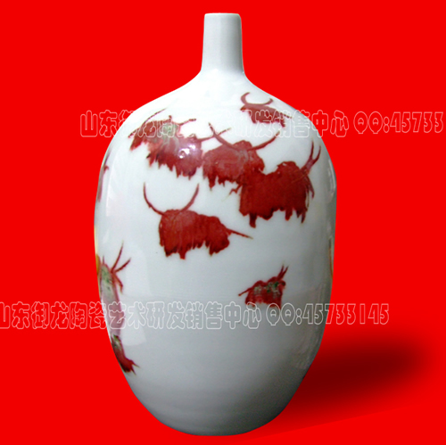 拉坯手繪釉里紅——紅牛瓶 特點(diǎn):1.肚圓充盈,首口高聳,上下串通,神氣膘豐。2.釉色瑩潤,紅中泛綠,融合之相。角碩體壯,宏發(fā)之兆。用途:1.作裝飾瓶,造型簡潔流暢,形象張揚(yáng)生動。靜中寓動。2.作燈座,以穩(wěn)健之紅光碩牛為基礎(chǔ),穩(wěn)重有內(nèi)涵,外形內(nèi)寓,渾然天成。