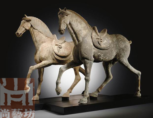 | 一對(duì)馬陶俑 | | 唐代 AD 618-907 | | 高:46cm | | 長(zhǎng): 48cm | | 寬:27cm |