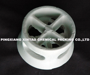 這種填料吸收了短拉西環(huán)的特點,也改變了填料的環(huán)高與直徑相等的習慣 ,降低了環(huán)的高度,減薄了材質(zhì)的厚度,并在環(huán)的側(cè)端增加了翻邊。 由于階梯環(huán)填料的側(cè)端增加了翻邊,不但可以增加填料環(huán)的機械強度,而且由于破壞了填料結(jié)構(gòu)的對稱性,因而增加了填料投放時的定向幾率。又由于翻邊的影響,使得填料在堆積時填料環(huán)隙之間的接觸由此線性接觸為主變?yōu)橐渣c接觸為主。這樣,不但增加了填料顆粒之間的空隙,減少了氣體穿過填料層的阻力,而且這些接觸點還可以為液體沿填料表面流動的匯聚分散點,從而促進了液膜的表面更新,有利于填料傳質(zhì)效率的提高。因此,階梯環(huán)填料的性能較鮑爾環(huán)又有了進一步的提高。 |