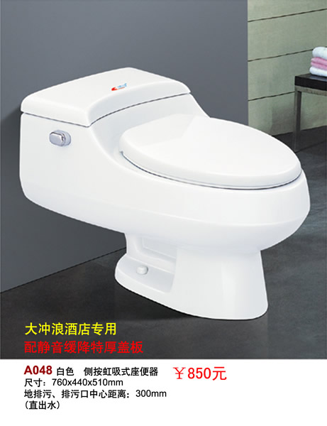 A048 白色 側(cè)按虹吸式座便器 ¥850元 尺寸:760*440*510mm 地排污、排污口中心距離:300mm(直出水) |
